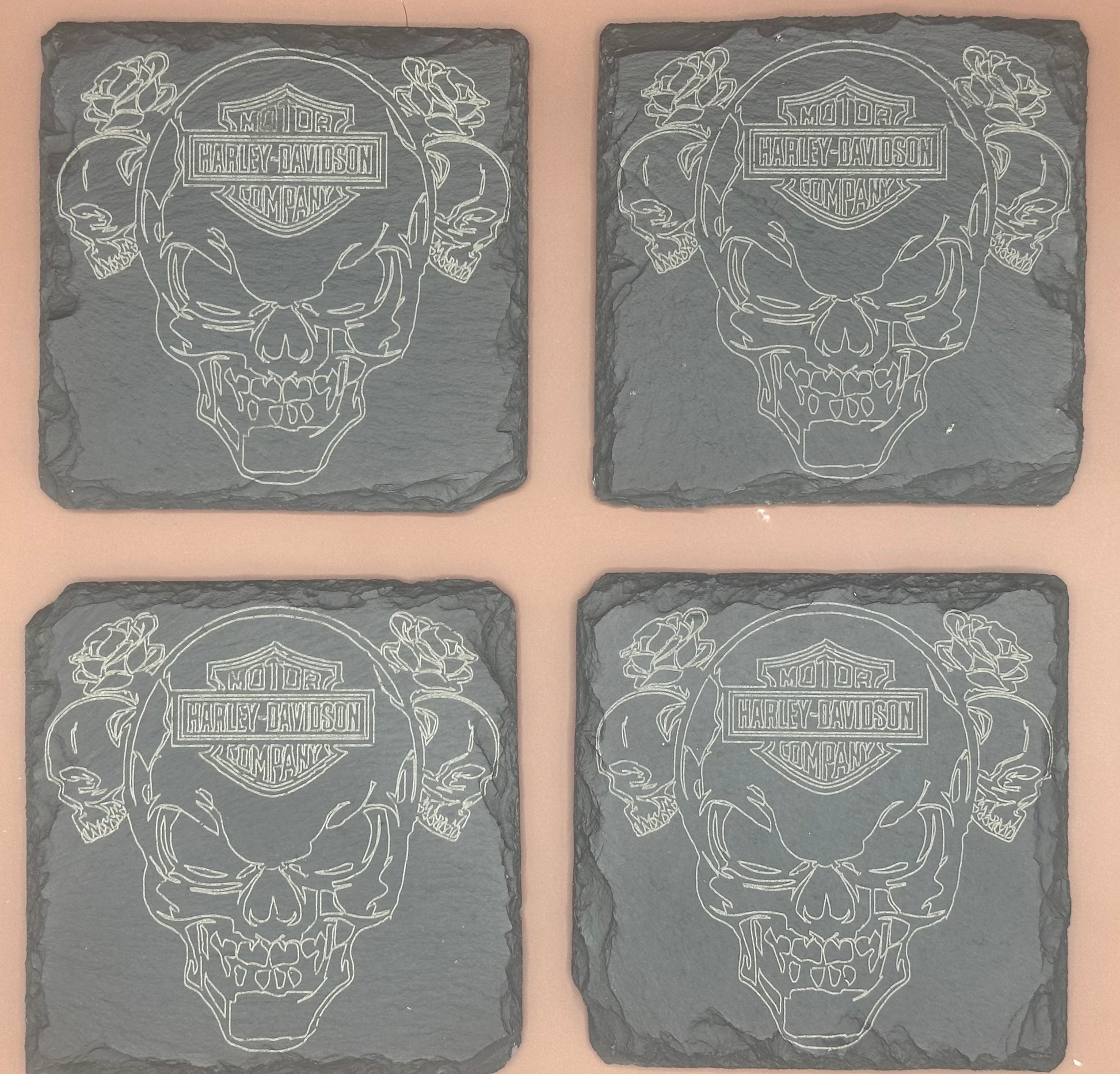 Our Slate Coaster Set is proudly made in the USA . So whether you're enjoying a cold drink or displaying them as decor, these coasters are sure to impress. Order yours today and add a touch of Harley Davidson to your home!